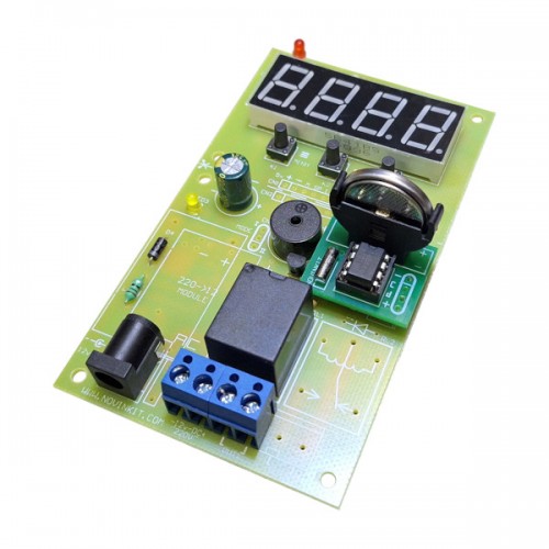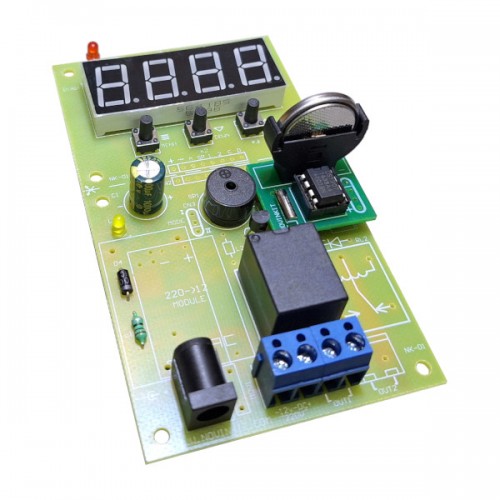 این برد یک تایمر ساعتی 12 ولت به همراه باتری بکاپ (پشتیبان) میباشد که قادر است یک وسیله برقی را درساعت مشخصی روشن و در ساعت مشخص خاموش کند. به طور مثال اگر زمان روشن شدن را روی 18:30 و زمان خاموش شدن را روی 23:45:12 تنظیم کنیم، رله در ساعت 18:30روشن و در ساعت 23:45:12 خاموش میشود. دقت کنید که ثانیه فقط در زمان خاموش شدن قابل تنظیم است و بدین ترتیب میتوان حداقل زمان 1 ثانیه را نیز با این برد کنترل کرد (مثلا برای آبیاری خودکار 5 ثانیه در هر شبانه روز، یا ایجاد یک پالس 1 ثانیه ای راس ساعت 1 بامداد برای قفل کردن درب پارکینگ و ...)