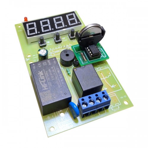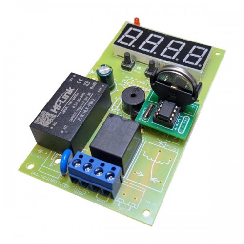 این برد یک تایمر ساعتی 220 ولت به همراه باتری بکاپ (پشتیبان) میباشد که قادر است یک وسیله برقی را درساعت مشخصی روشن و در ساعت مشخص خاموش کند. به طور مثال اگر زمان روشن شدن را روی 18:30 و زمان خاموش شدن را روی 23:45:12 تنظیم کنیم، رله در ساعت 18:30روشن و در ساعت 23:45:12 خاموش میشود. دقت کنید که ثانیه فقط در زمان خاموش شدن قابل تنظیم است و بدین ترتیب میتوان حداقل زمان 1 ثانیه را نیز با این برد کنترل کرد (مثلا برای آبیاری خودکار 5 ثانیه در هر شبانه روز، یا ایجاد یک پالس 1 ثانیه ای راس ساعت 1 بامداد برای قفل کردن درب پارکینگ و ...)